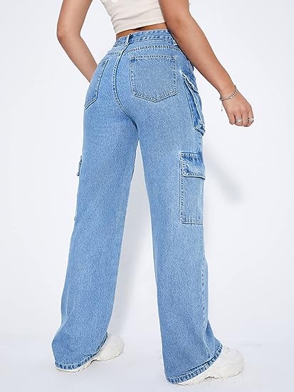 Women's High Waist Cargo Jeans Flap Pocket Straight Leg Denim Pants