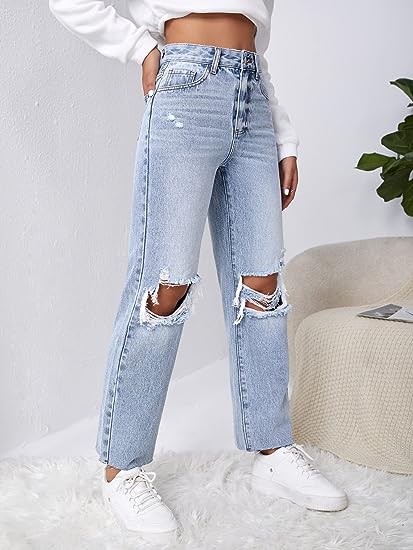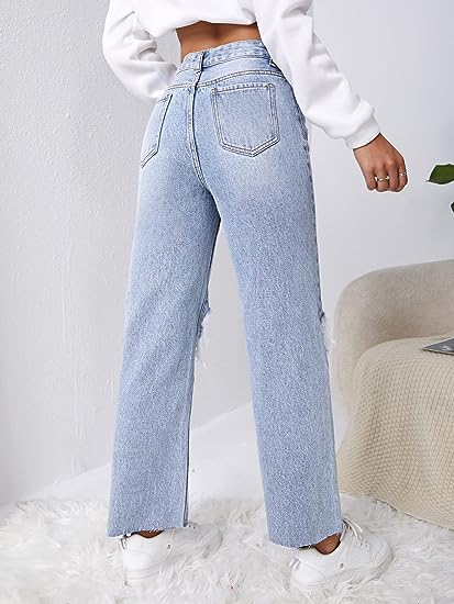 Women's High Waist Straight Leg Ripped Jeans Distressed Denim Pants