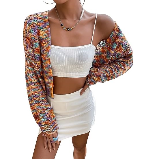Features: Open front, long sleeve, colorful space dye, drop shoulder, cropped length.