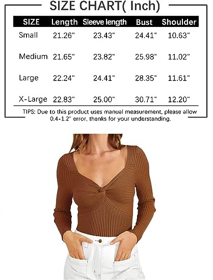 Design details: fashion tops, knit twist knot front top, long sleeve pullover sweater, twist front, crisscross knot front, ribbed nit, sleeveless, cropped length, solid color, slim fit.